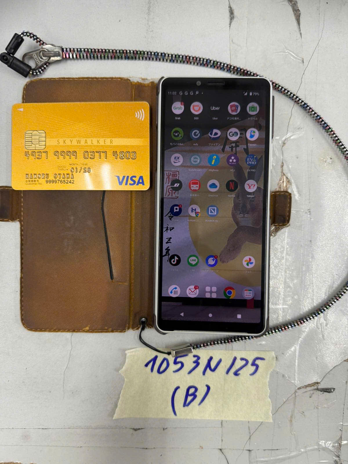 Ngày tiếp nhận: 09/6/2025 Mã hồ sơ: 1053N2025B Mô tả: 01 điện thoại có logo chữ Sony Xperia màu trắng cùng ốp giống da màu xanh bên trong có thẻ ngân hàng có tren Mamoru Oyama. |