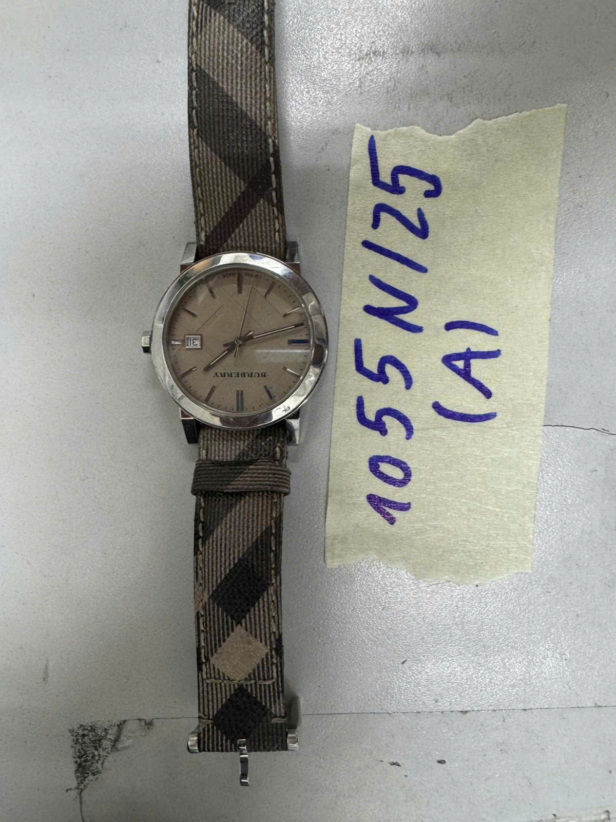 Ngày tiếp nhận: 09/6/2025 Mã hồ sơ: 1055N2025A Mô tả: 01 đồng hồ có logo chữ Burberry mặt đồng hồ màu nâu, dây đeo bằng da màu sọc xám. |