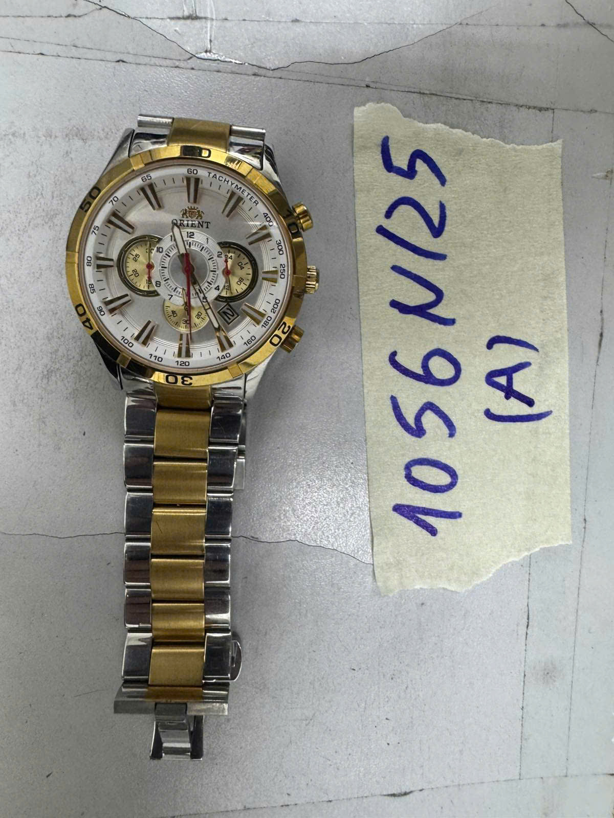 Ngày tiếp nhận: 09/6/2025 Mã hồ sơ: 1056N2025A Mô tả: 01 đồng hồ mặt tròn màu vàng có logo chữ Orient, dây đeo kim loại màu vàng. |