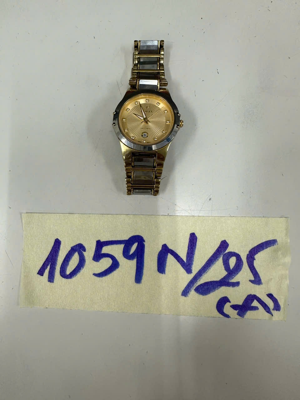 Ngày tiếp nhận: 09/6/2025 Mã hồ sơ: 1059N2025A Mô tả: 01 đồng hồ màu vàng dây kim loại màu vàng mặt tròn có chữ Aolix. |