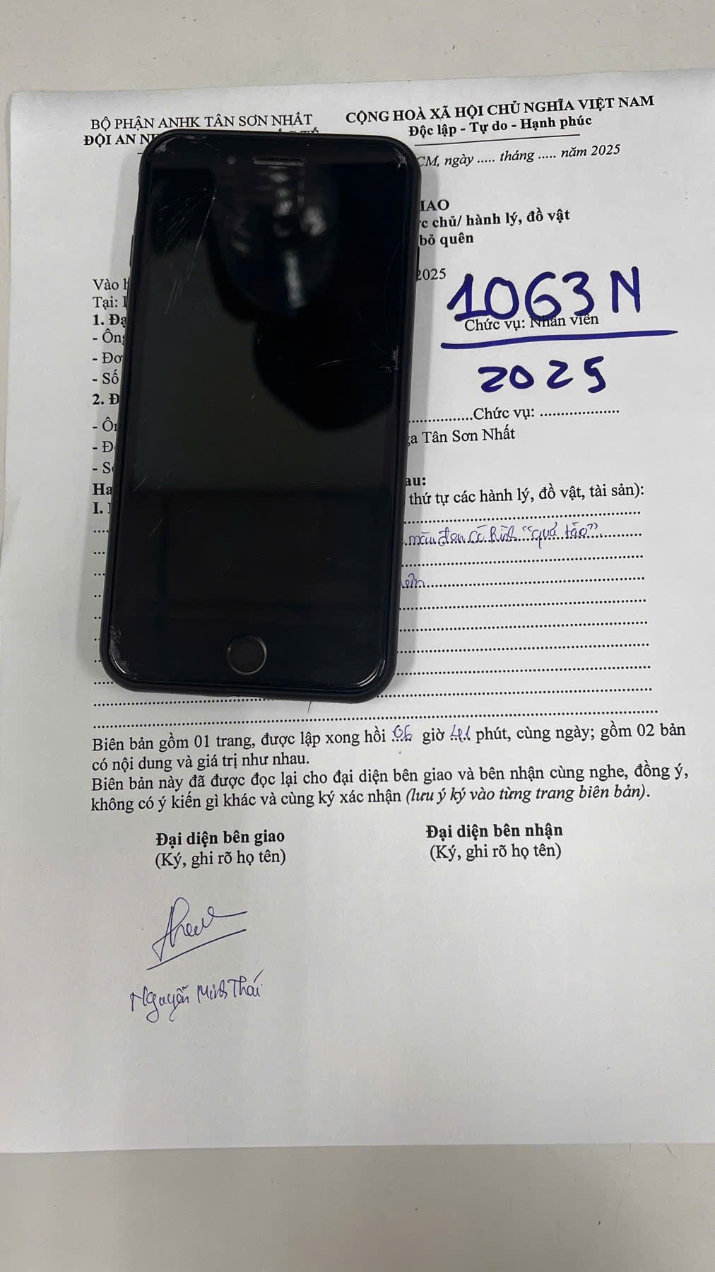 Ngày tiếp nhận: 09/6/2025 Mã hồ sơ: 1052N2025A Mô tả: 01 điện thoại iphone màu đen ốp lưng màu xanh dương. |