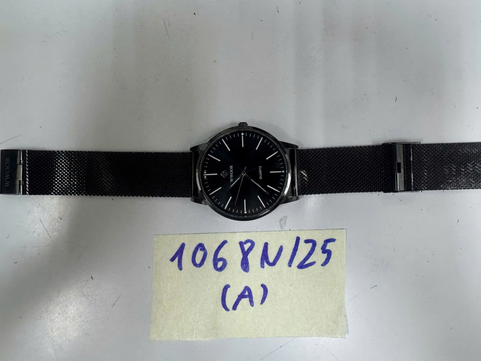 Ngày tiếp nhận: 11/6/2025 Mã hồ sơ: 1068N2025A Mô tả: 01 đồng hồ màu đen mặt tròn có chữ WWOOR. |
