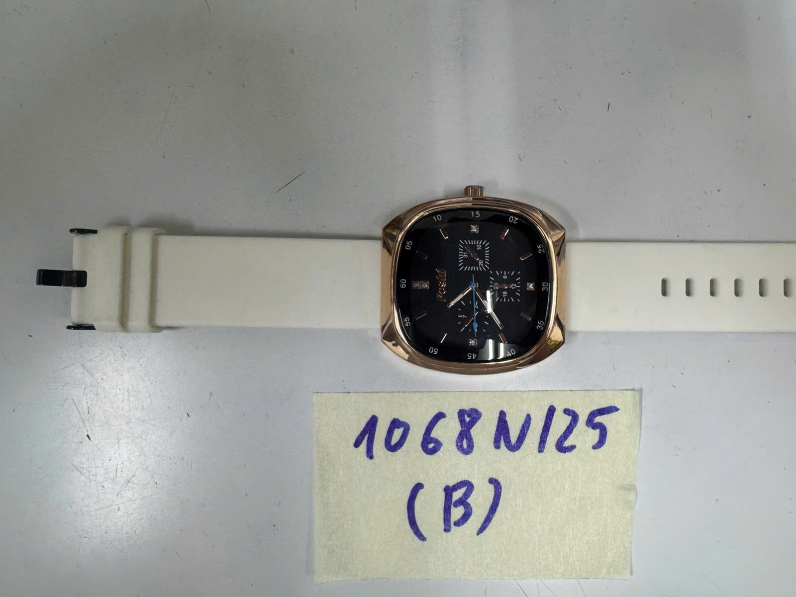 Ngày tiếp nhận: 11/6/2025 Mã hồ sơ: 1068N2025C Mô tả: 01 đồng hồ mặt kim loại hình vuông màu vàng, dây cao su màu trắng có chữ POSHI. |