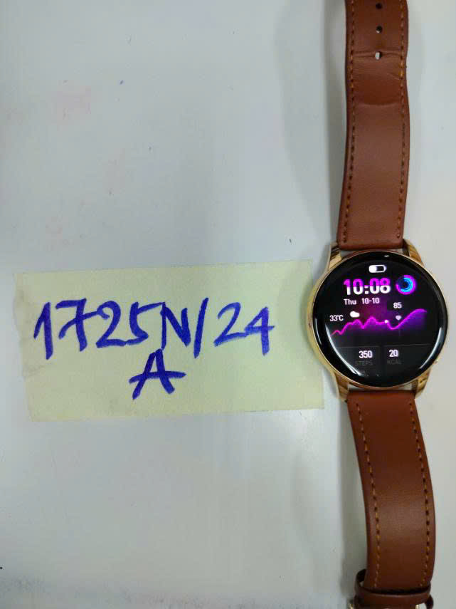 Ngày tiếp nhận: 10/10/2024 Mã hồ sơ: 1725N2024A Mô tả: 01 đồng hồ thông minh mặt hình tròn màu đen viền vàng đồng dây đeo bằng da màu nâu. |
