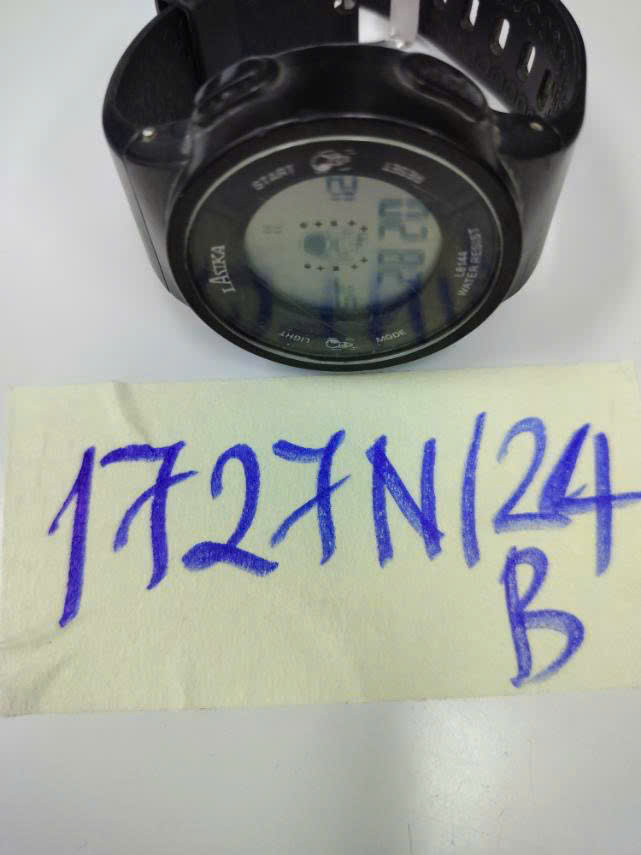 Ngày tiếp nhận: 10/10/2024 Mã hồ sơ: 1727N2024B Mô tả: 01 đồng hồ màu đen dây cao su màu đen trên đồng hồ có chữ LASIKA. |