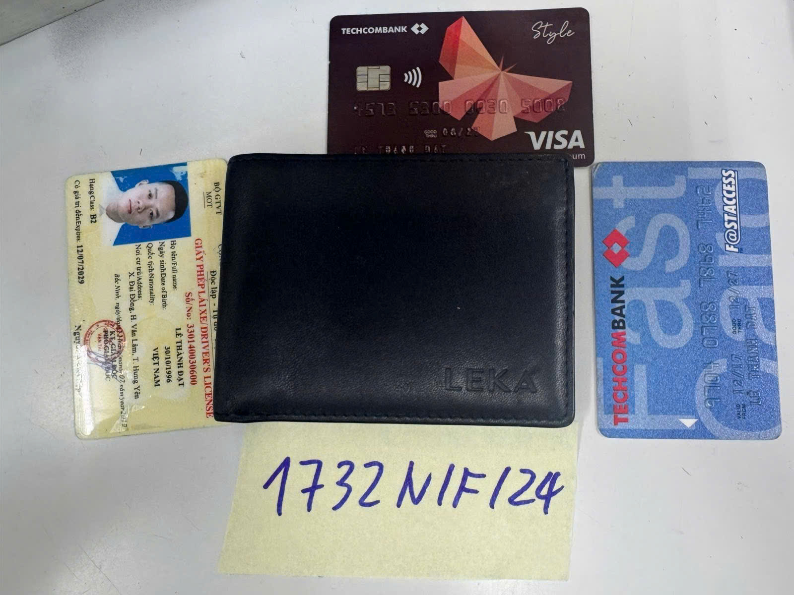 Ngày tiếp nhận: 10/10/2024 Mã hồ sơ: 1732N2024F Mô tả: 01 ví da màu xanh đen có chữ LEKA ( bên trong có hai thẻ ngân hàng Techcombank và một bằng lái xe đều tên lê Thành Đạt). |