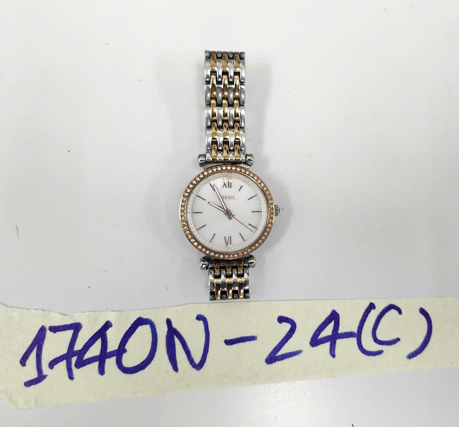 Ngày tiếp nhận: 11/10/2024 Mã hồ sơ: 1740N2024C Mô tả: 01 đồng hồ kim loại mặt trắng Fossil. |