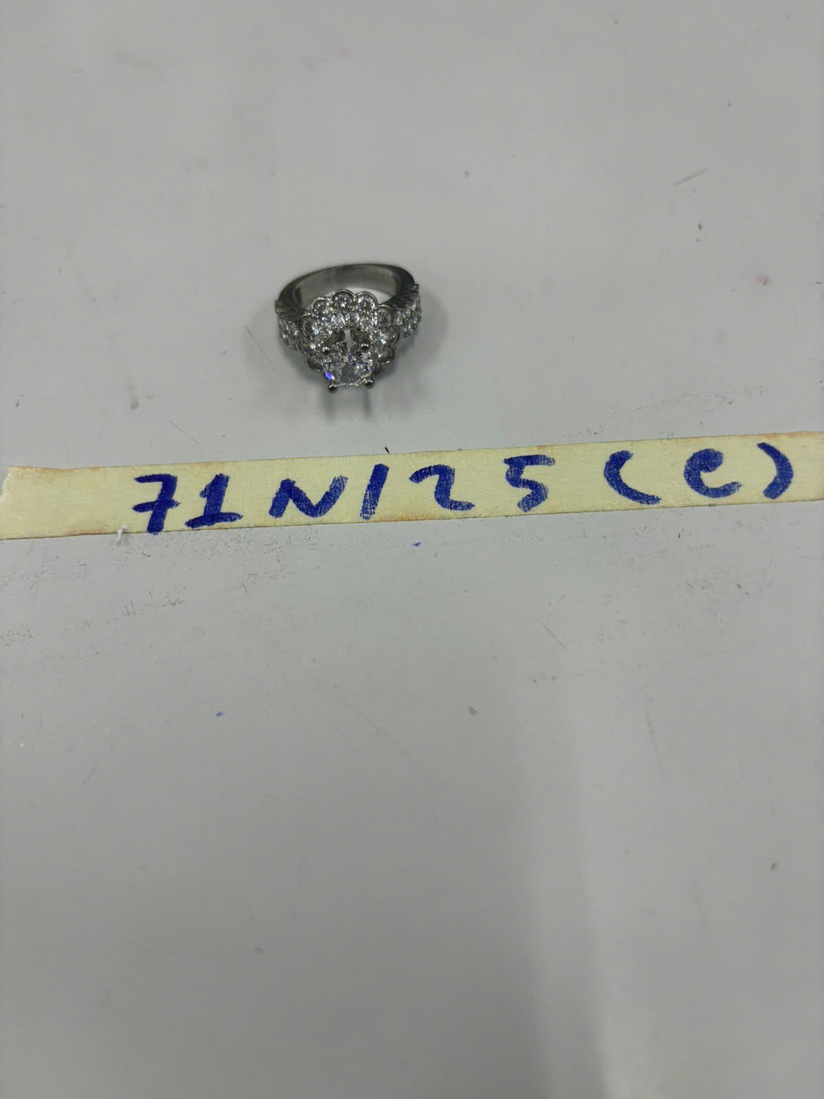 Ngày tiếp nhận: 11/01/2025 Mã hồ sơ: 71N2025C Mô tả: 01 nhẫn màu trắng đính 13 viên đá màu trắng đã qua sử dụng. |