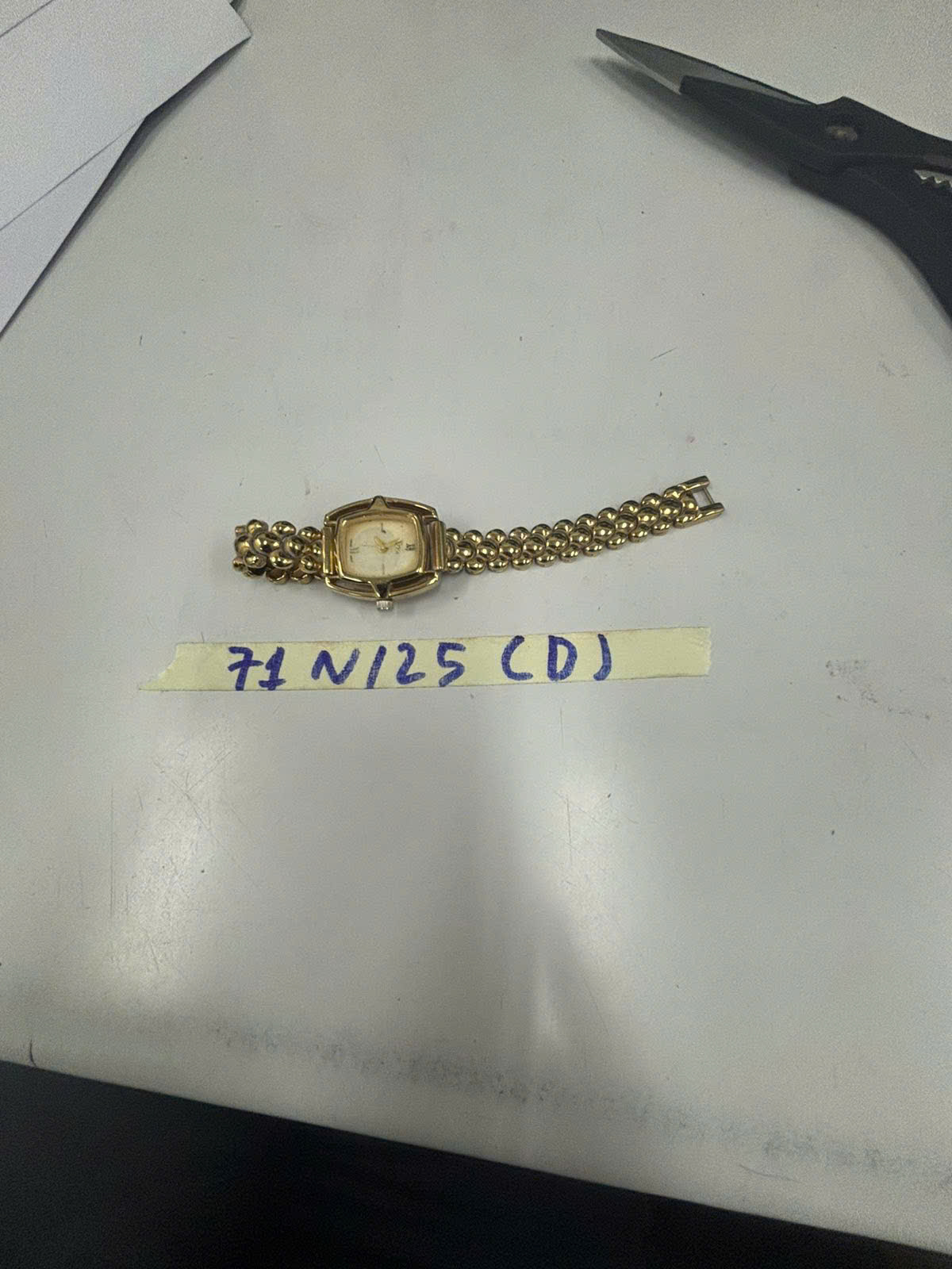Ngày tiếp nhận: 11/01/2025 Mã hồ sơ: 71N2025D Mô tả: 01 đồng hồ màu vàng có dây đeo màu vàng, đăng sau có chữ "Dior". |
