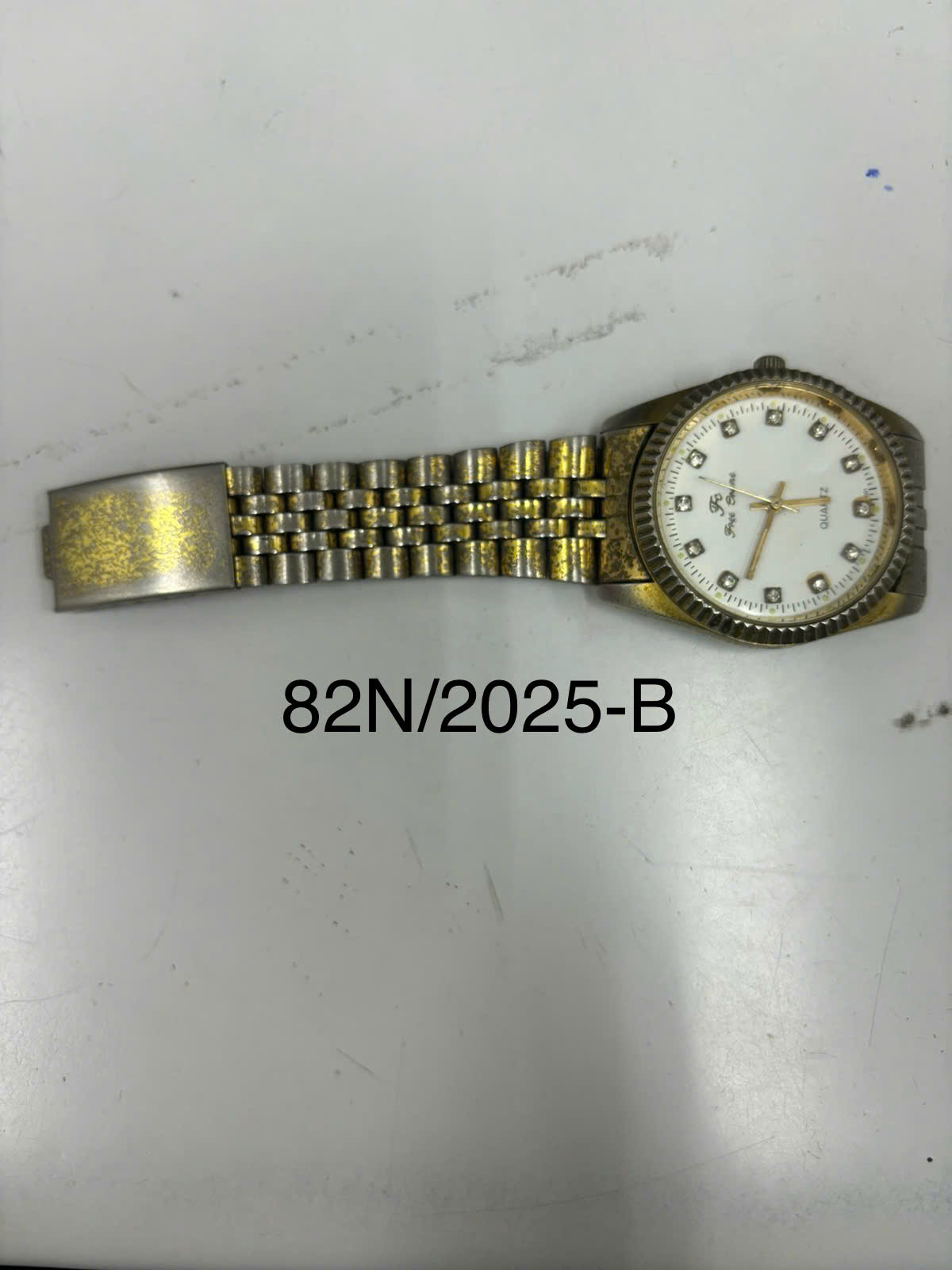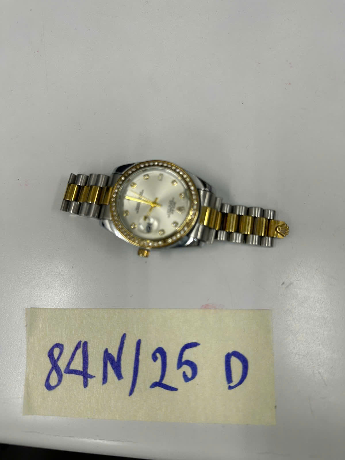 Ngày tiếp nhận: 13/01/2025 Mã hồ sơ: 84N2025D Mô tả: 01 đồng hồ đeo tay bằng kim loại màu trắng viền vàng, mặt đồng nồ hình tròn in logo chữ "ROLEX". |