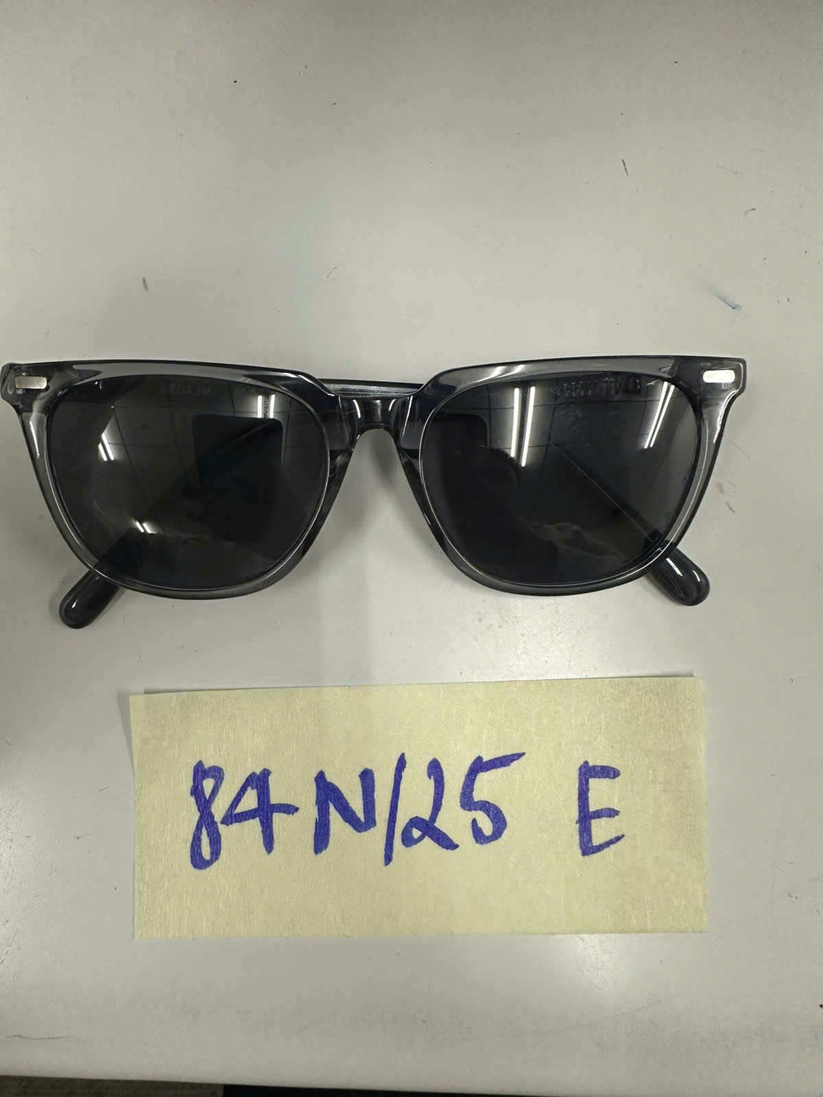Ngày tiếp nhận: 13/01/2025 Mã hồ sơ: 84N2025E Mô tả: 01 mắt kính gọng nhựa màu đen, tròng mắt màu đen in logo chữ "MEGA HA". |