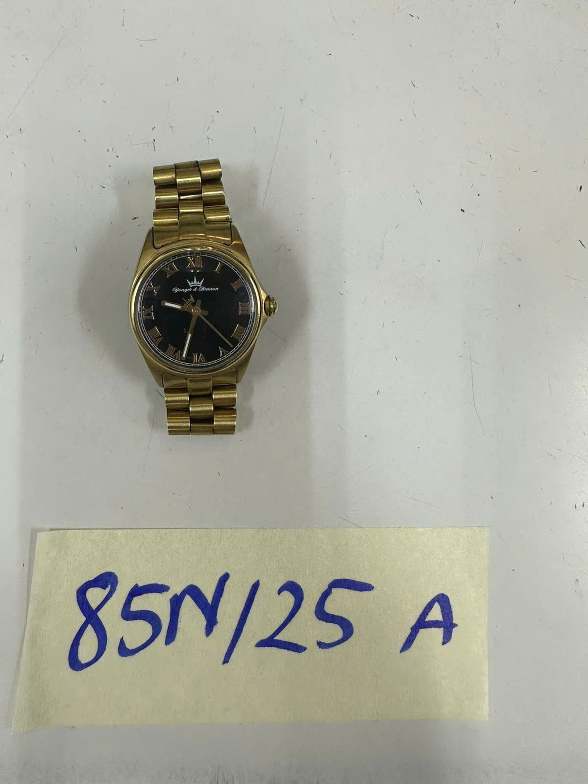 Ngày tiếp nhận: 13/01/2025 Mã hồ sơ: 85N2025A Mô tả: 01 đồng hồ kim bằng kim loại màu vàng có chữ "YONGET OF BROSSON", dây deo bảng kim loại màu vàng. |