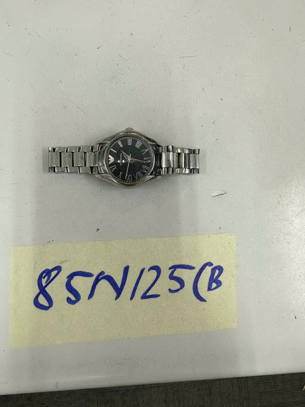 Ngày tiếp nhận: 13/01/2025 Mã hồ sơ: 85N2025B Mô tả: 01 đồng hồ kim bằng kim loại màu bạc có chữ "EMPORIO ARMANI", dây đeo bằng kim loại màu bạc. |