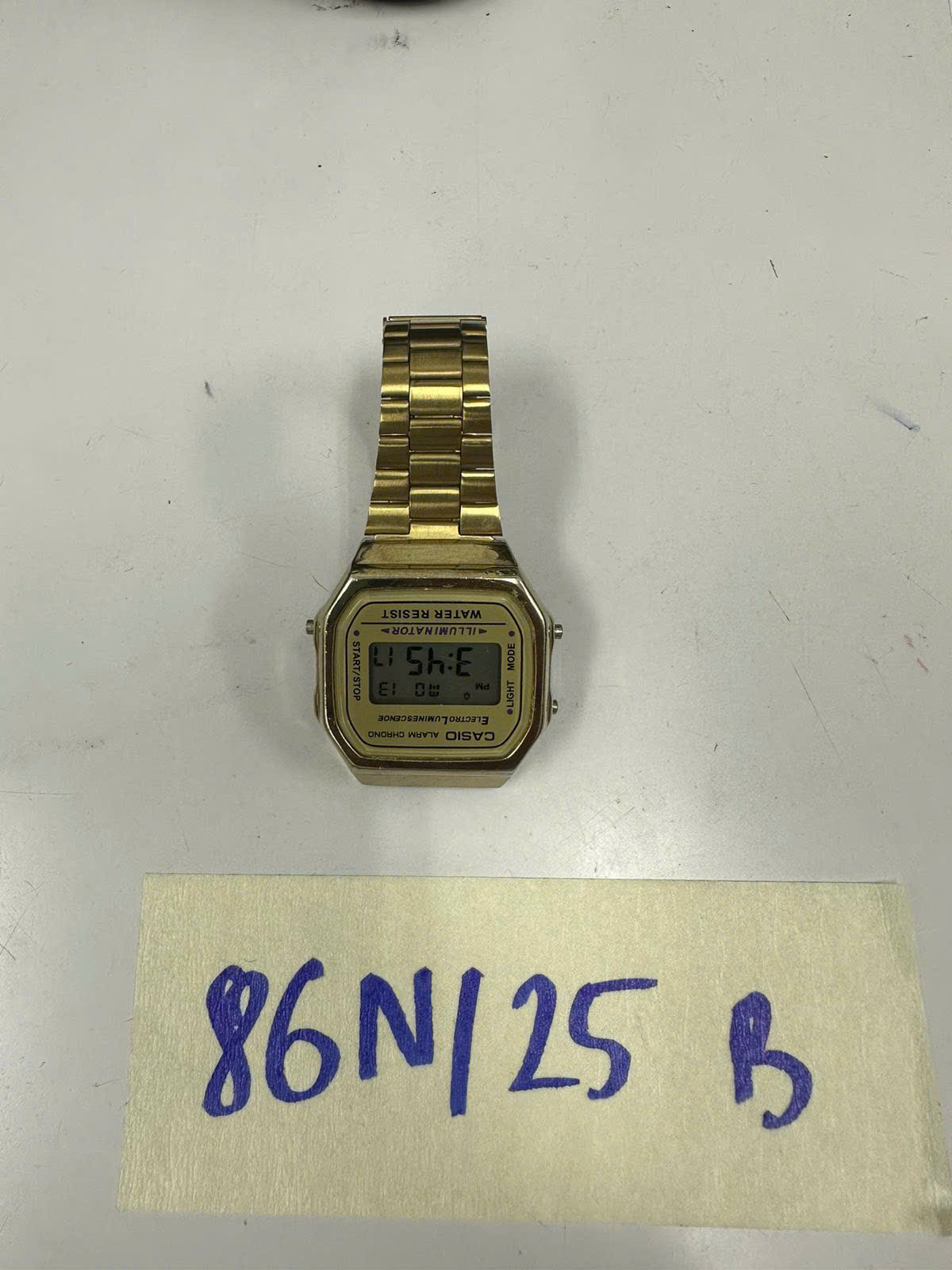 Ngày tiếp nhận: 13/01/2025 Mã hồ sơ: 86N2025B Mô tả: 01 đồng hồ điện tử màu vàng đồng, dây kim loại, có chữ "CASIO". |