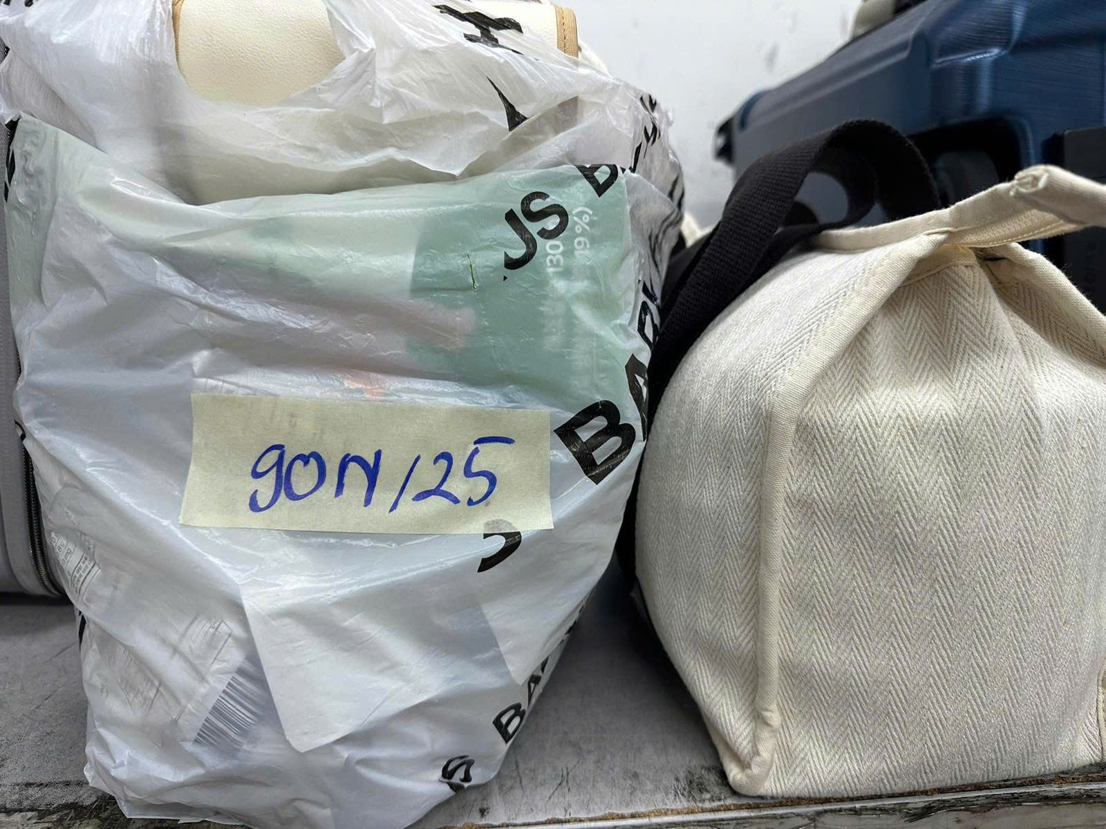 Ngày tiếp nhận: 13/01/2025 Mã hồ sơ: 90N2025 Mô tả: 01 Túi vải màu trắng bên trong có quần áo và sử dụng + 01 túi nilông có đồ cá nhân qua sử dụng. |