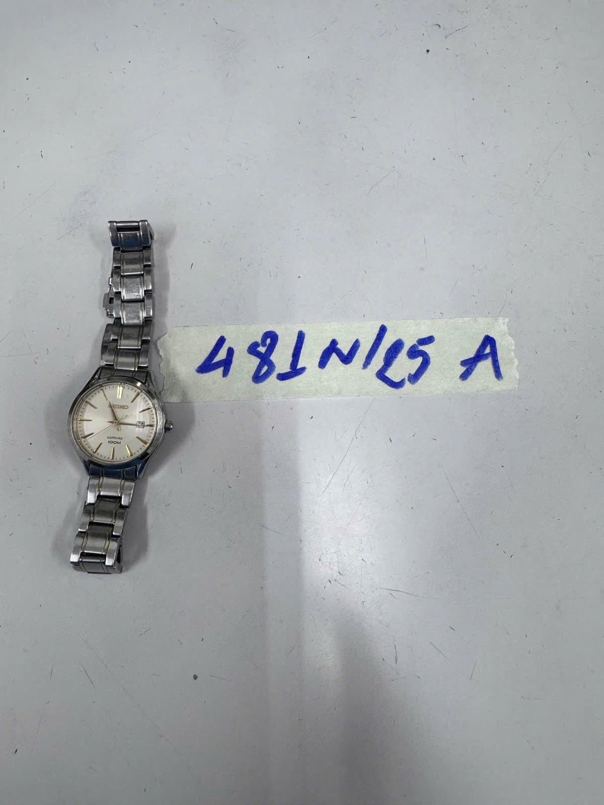 Ngày tiếp nhận: 11/03/2025 Mã hồ sơ: 481N2025A Mô tả: 01 đồng hồ màu bạc mặt tròn dây kim loại màu bạc chữ SEIKO. |