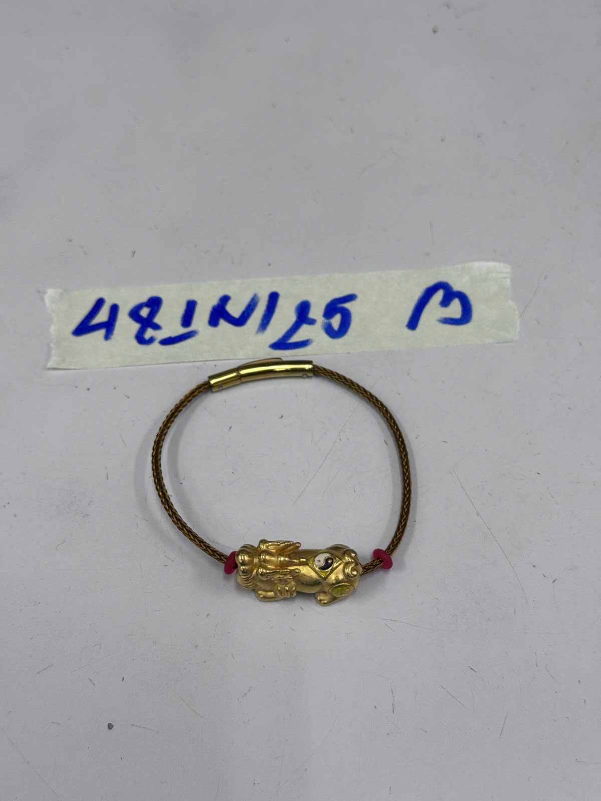 Ngày tiếp nhận: 11/03/2025 Mã hồ sơ: 481N2025B Mô tả: 01 vòng tay kim loại màu vàng có charm tỳ hươu. |