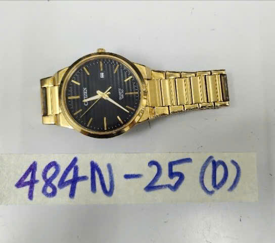 Ngày tiếp nhận: 12/03/2025 Mã hồ sơ: 484N2025D Mô tả: 01 đồng hồ bằng kim loại, màu vàng có chữ "CITIZEN". |