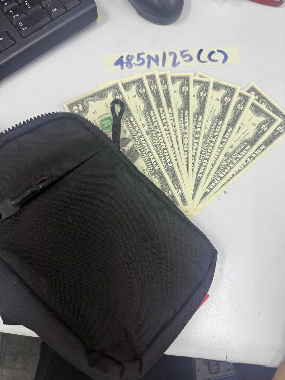 Ngày tiếp nhận: 13/03/2025 Mã hồ sơ: 485N2025C Mô tả: 01 túi đeo nhỏ màu đen không rõ thương hiệu, bên trong có 10 (mười) tờ 2 đô. |