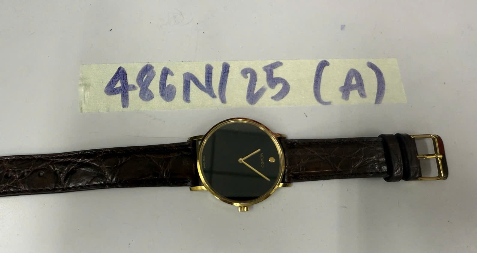 Ngày tiếp nhận: 13/03/2025 Mã hồ sơ: 486N2025A Mô tả: 01 đồng hồ mặt hình tròn màu đen, viền màu vàng, dây đeo da màu nâu có chữ MOVADO. |