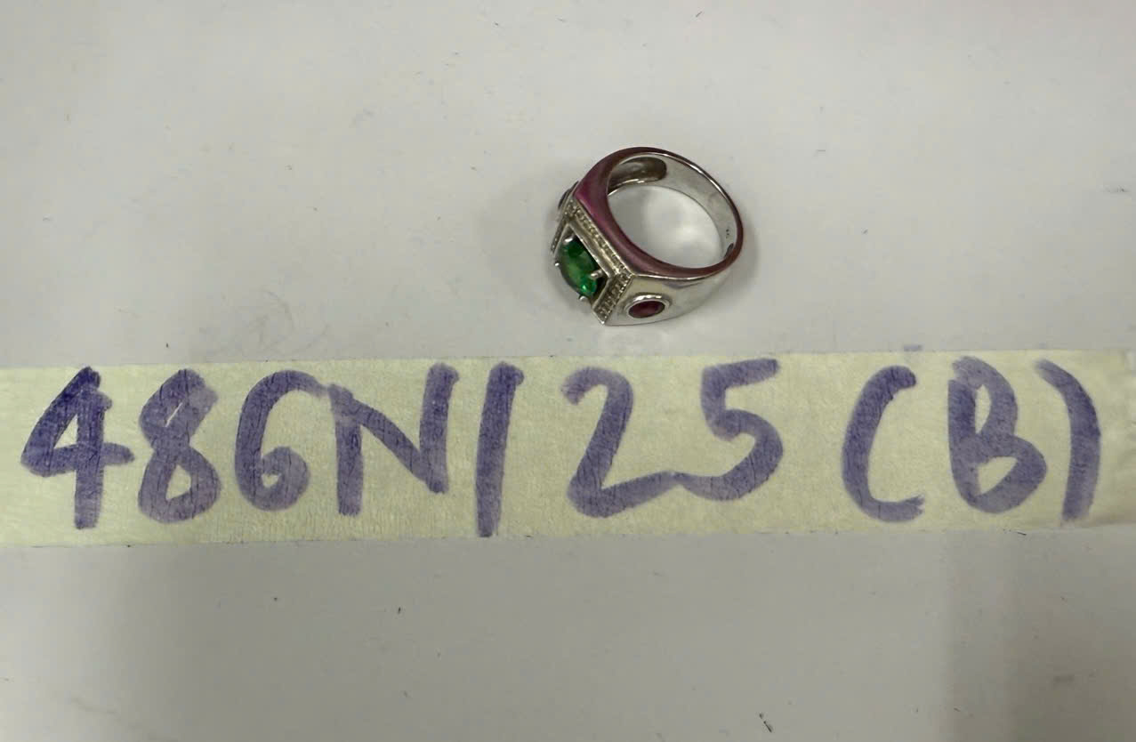 Ngày tiếp nhận: 13/03/2025 Mã hồ sơ: 486N2025B Mô tả: 01 nhẫn màu trắng có định đá màu xanh lá cây, màu trắng, màu đỏ. |
