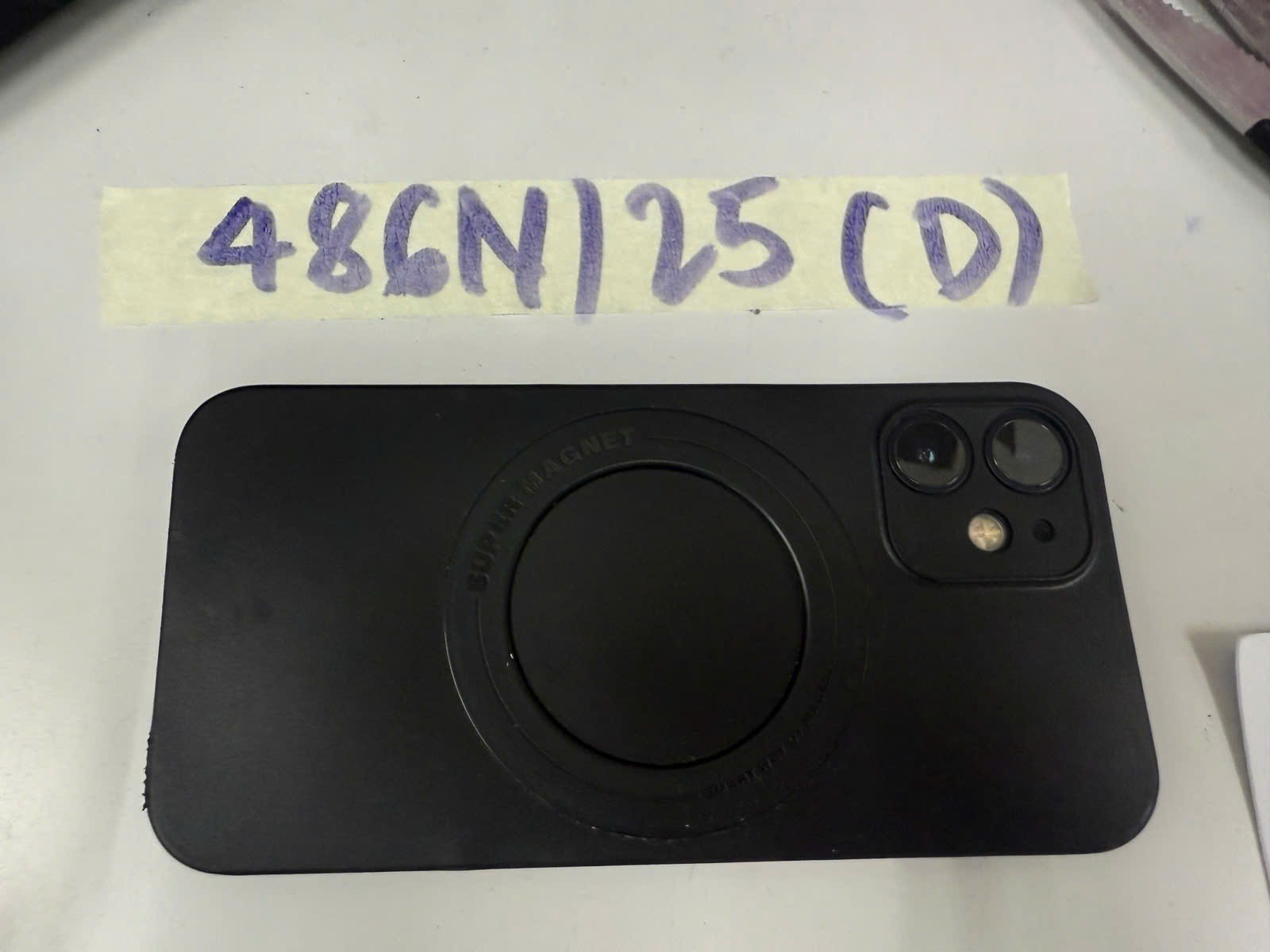 Ngày tiếp nhận: 13/03/2025 Mã hồ sơ: 486N2025D Mô tả: 01 điện thoại có logo Apple màu đen, case màu đen có chữ SUPER MAGNET. |