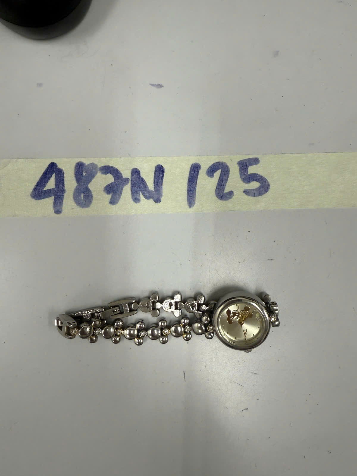 Ngày tiếp nhận: 13/03/2025 Mã hồ sơ: 487N2025 Mô tả: 01 đồng hồ kim loại màu trắng, mặt tròn có logo chữ "Disney" qua sử dụng. |