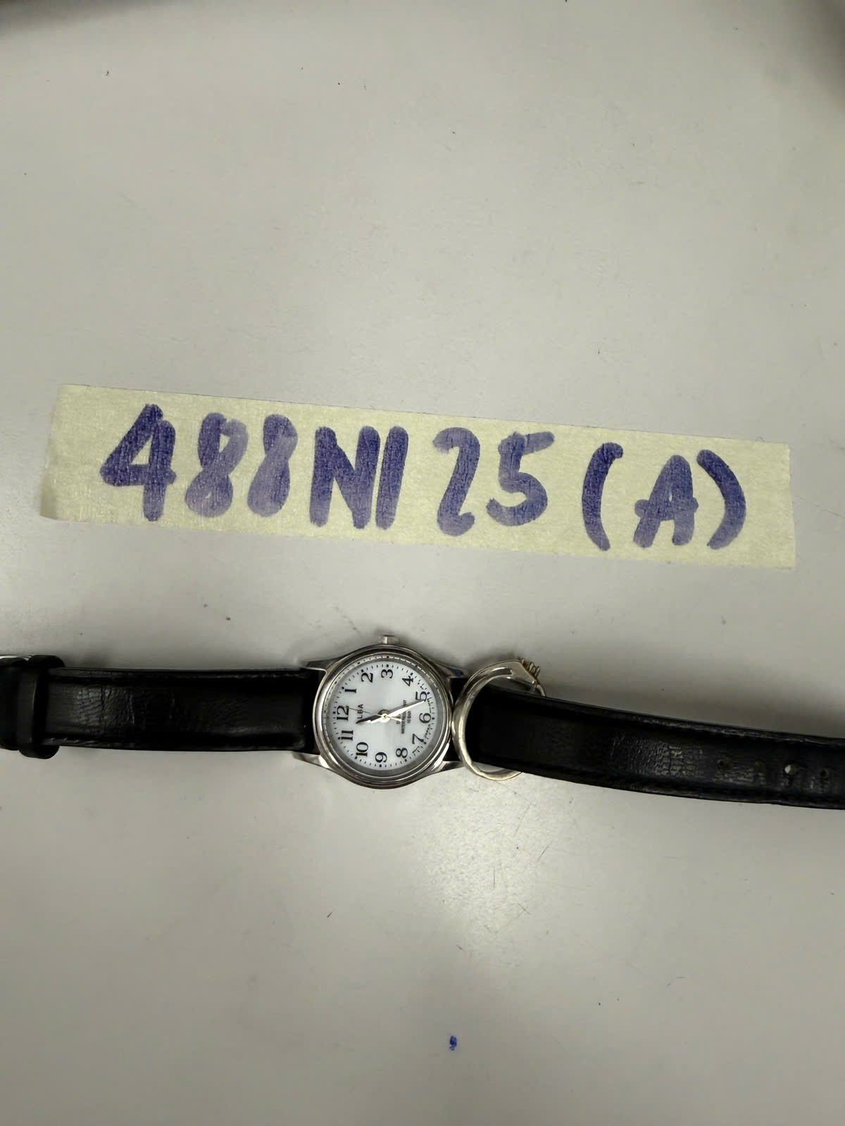 Ngày tiếp nhận: 13/03/2025 Mã hồ sơ: 488N2025A Mô tả: 01 đồng hồ kim loại mặt tròn màu bạc, dây giống da màu đen, mặt có chữ "ALBA". |