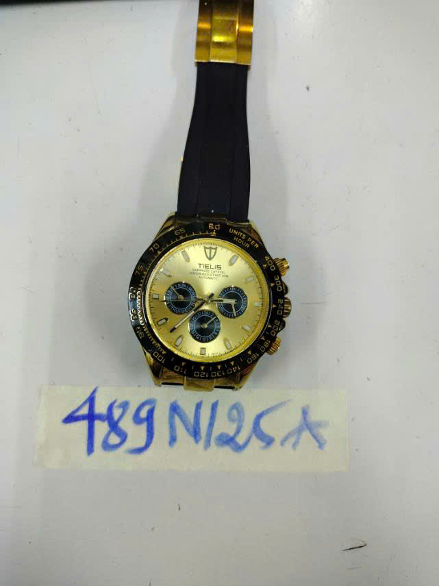 Ngày tiếp nhận: 13/03/2025 Mã hồ sơ: 489N2025A Mô tả: 01 đồng hồ kim loại mặt tròn màu vàng đồng có chữ TIELIS dây cao su màu đen. |