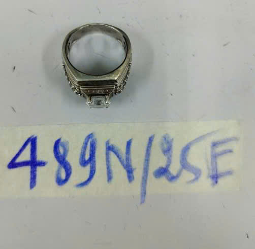 Ngày tiếp nhận: 13/03/2025 Mã hồ sơ: 489N2025E Mô tả: 01 nhẫn kim loại màu bạc, có đính một viên (vật liệu giống đá). |