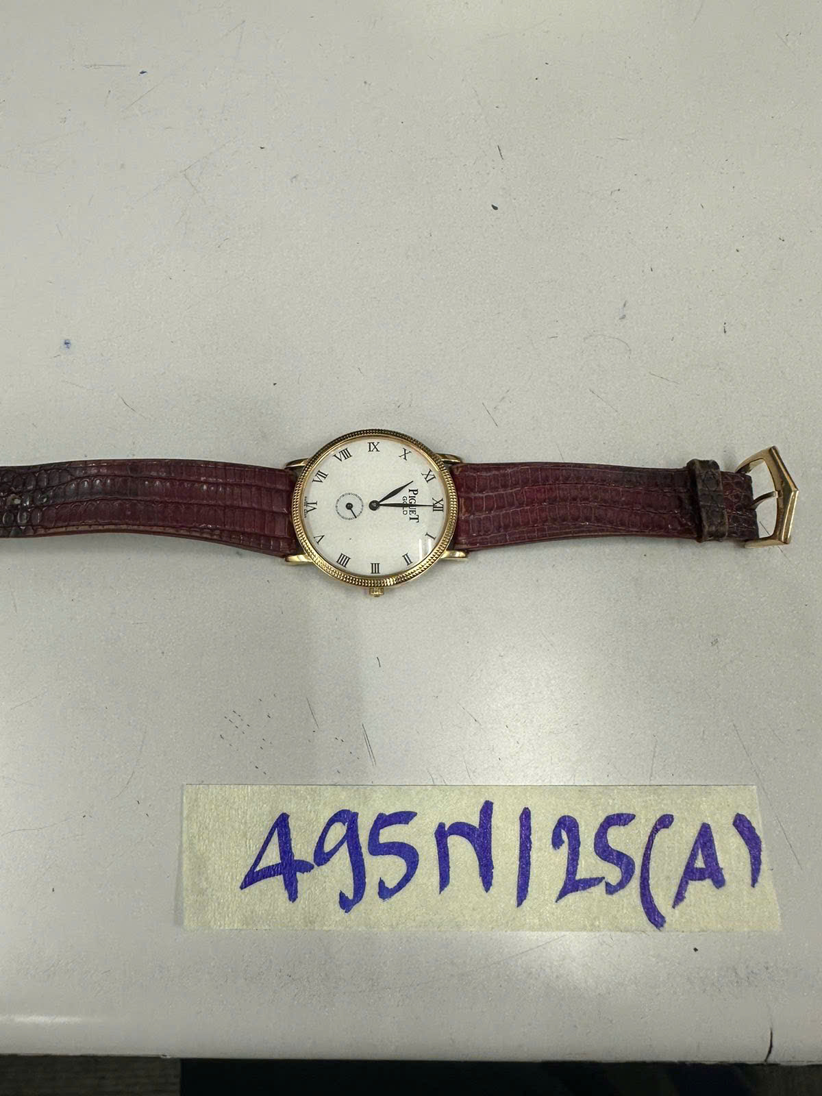 Ngày tiếp nhận: 13/03/2025 Mã hồ sơ: 495N2025A Mô tả: 01 đồng hồ mặt màu trắng, viền vàng, mặt đồng hồ có ghi chữ" PIGUET GOLD" dây da màu đỏ qua sử dụng. |