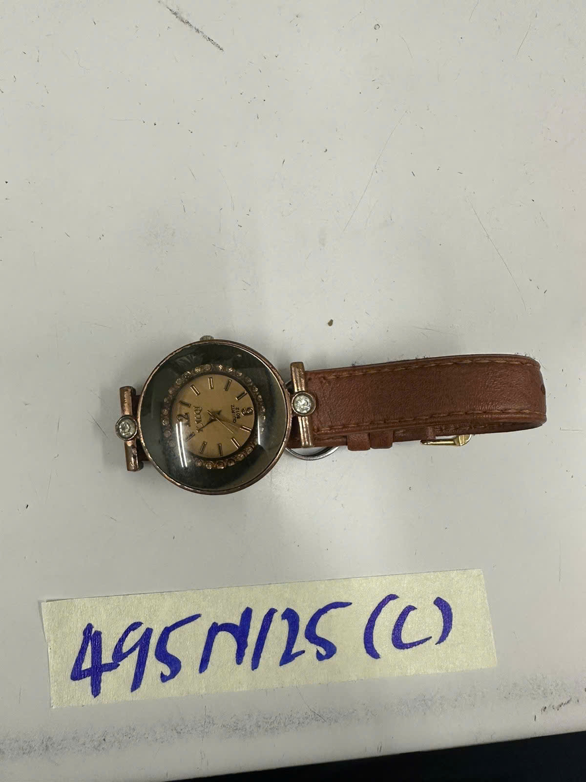 Ngày tiếp nhận: 13/03/2025 Mã hồ sơ: 495N2025C Mô tả: 01 đồng hồ dây da màu nâu mặt kim loại có ghi chữ KALQI. |