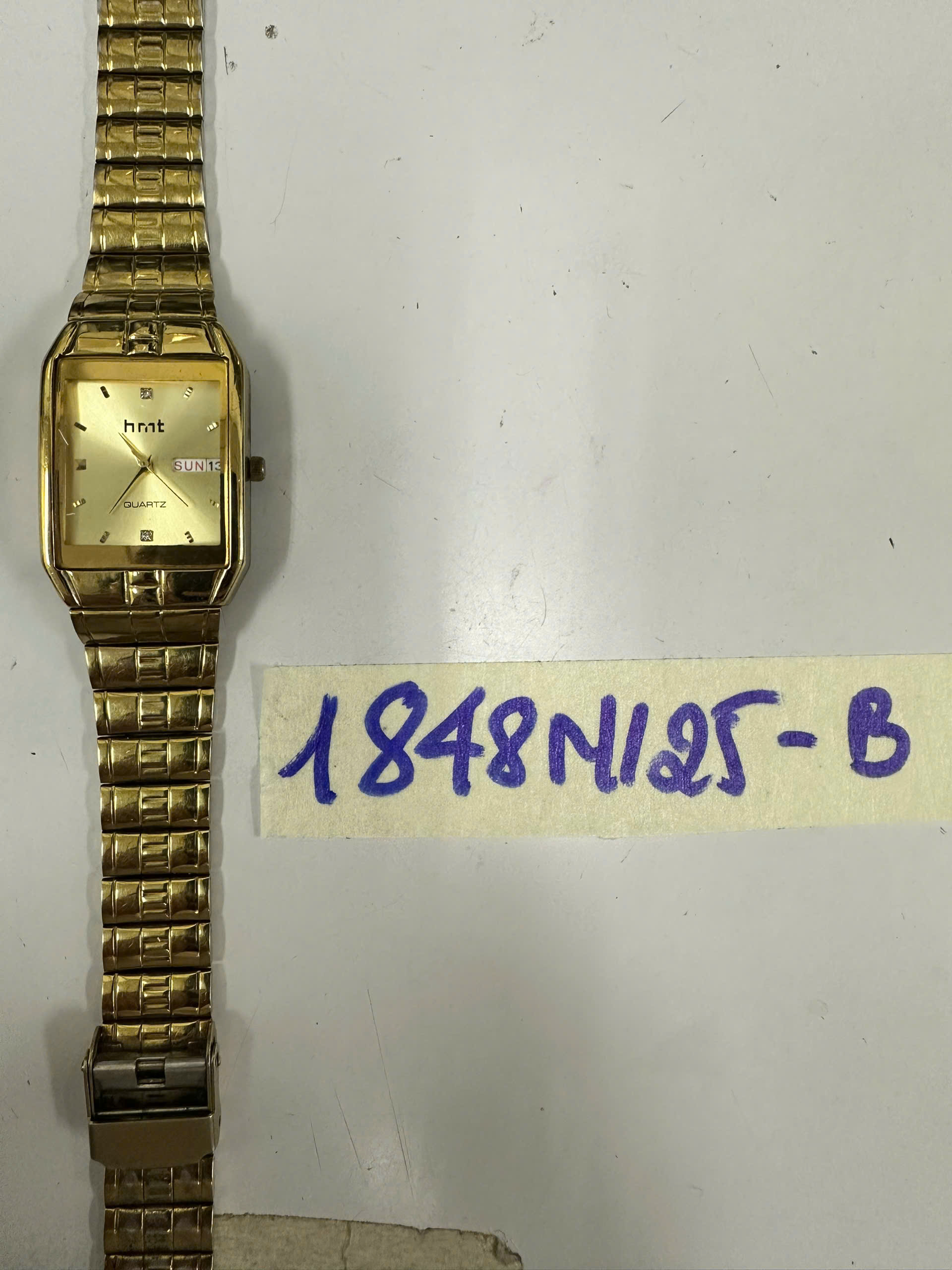 Ngày tiếp nhận: 13/10/2025 Mã hồ sơ: 1848N2025B Mô tả: 01 đồng hồ kim loại mặt chữ nhật màu vàng chữ HMT QUARTZ, dây đeo kim loại vàng. |