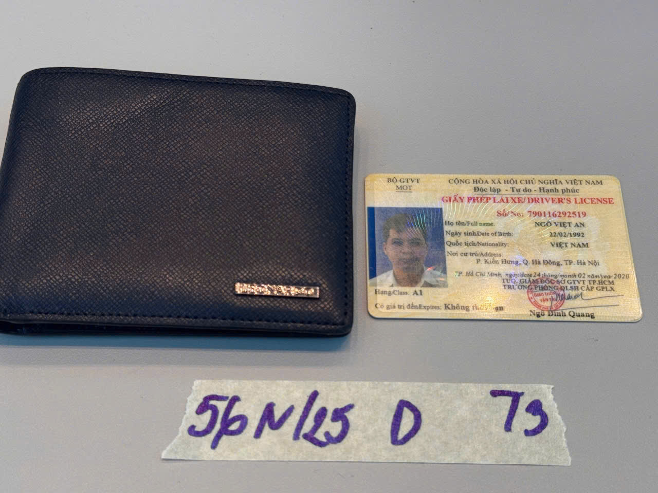 Ngày tiếp nhận: 11/10/2025 Mã hồ sơ: 56N2025D Mô tả: 01 ví nho màu xanh dương đậm có tag chữ LEOCARDO, trong ví có: các loại thẻ ngâng hàng, giấy phép lái xe..., tất cả đã qua sử dụng. |