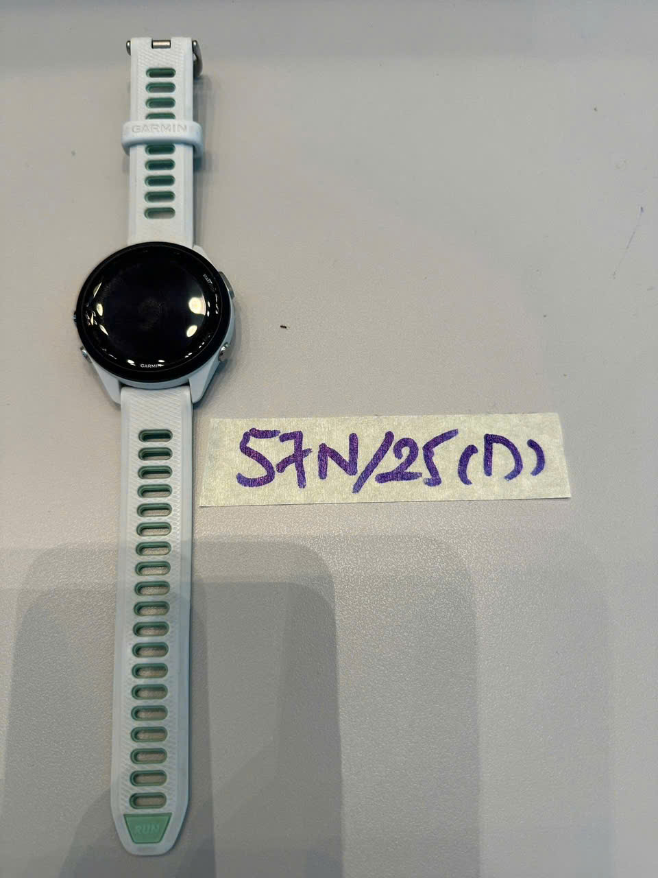 Ngày tiếp nhận: 11/10/2025 Mã hồ sơ: 57N2025D Mô tả: 01 đồng hồ dây cao su màu trắng - xanh lá, mặt đồng hồ điện tử có chữ GARMIN. |
