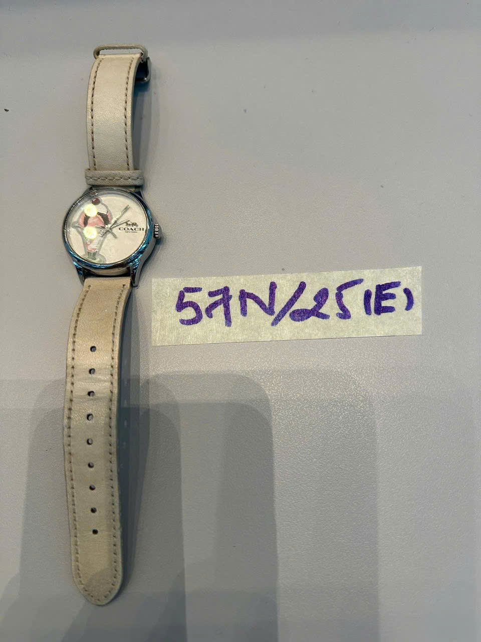 Ngày tiếp nhận: 11/10/2025 Mã hồ sơ: 57N2025E Mô tả: 01 đồng hồ màu trắng dây da, mặt tròn có chữ COACH. |