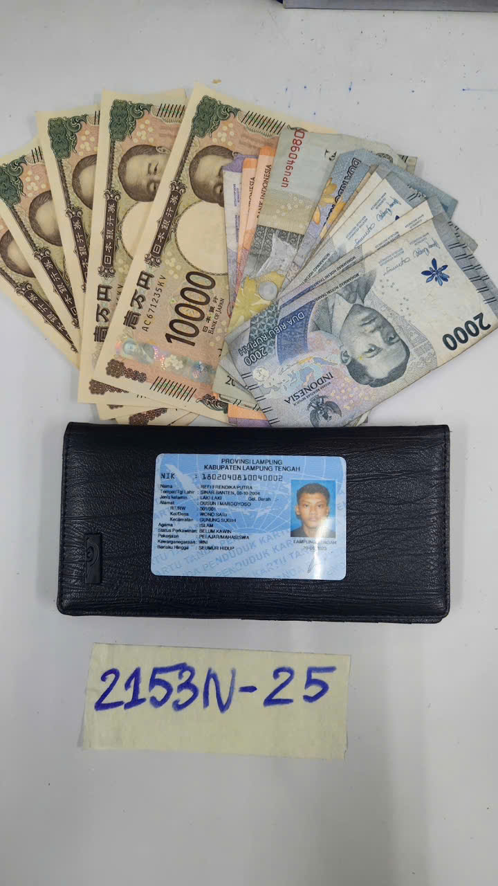 Ngày tiếp nhận: 11/12/2025 Mã hồ sơ: 2153N2025 Mô tả: 01 ví da màu đen đã sd có: 50.000 yen Nhật, 89.000 tiền Indonesia, giấy tờ có tên REFI PUTRA. |