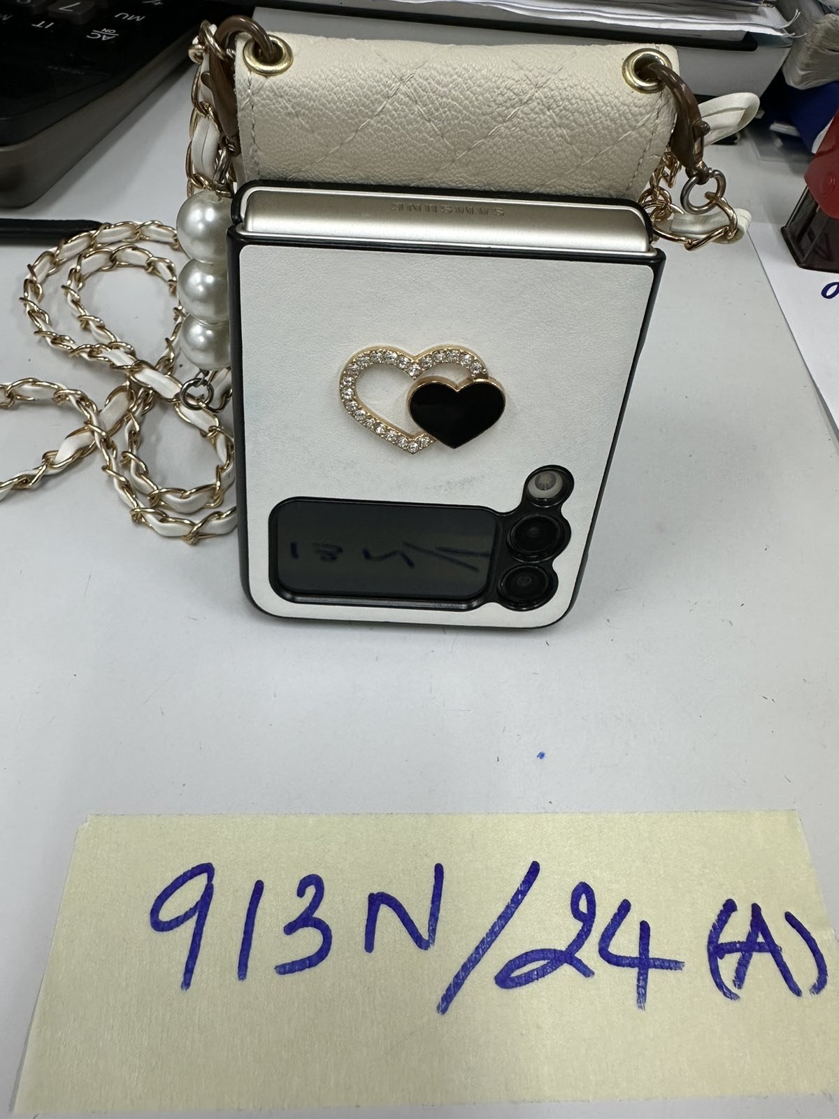 Ngày tiếp nhận: 11/6/2024 Mã hồ sơ: 913N2024A Mô tả: 01 Điện thoại di động SAMSUNG nắp gập + ốp lưng dây đeo màu trắng. |