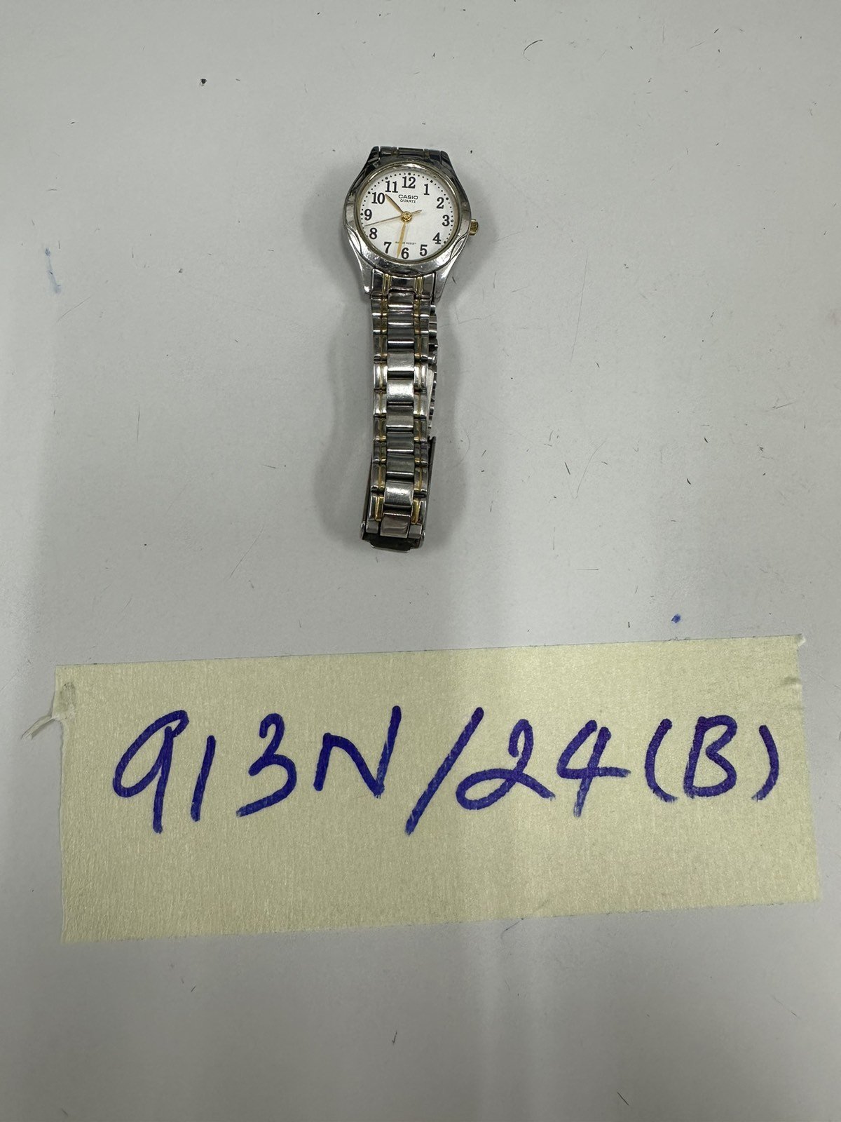 Ngày tiếp nhận: 02/6/2024 Mã hồ sơ: 913N2024B Mô tả: 01 đồng hồ dây kim loại màu bạc bên trong có ghi chữ Casio Quatz. |