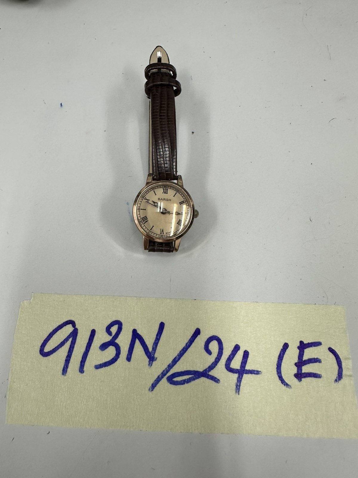 Ngày tiếp nhận: 11/6/2024 Mã hồ sơ: 913N2024E Mô tả: 01 đồng hồ dây da màu nâu, mặt tròn bên trong có ghi chữ "Barsh". |