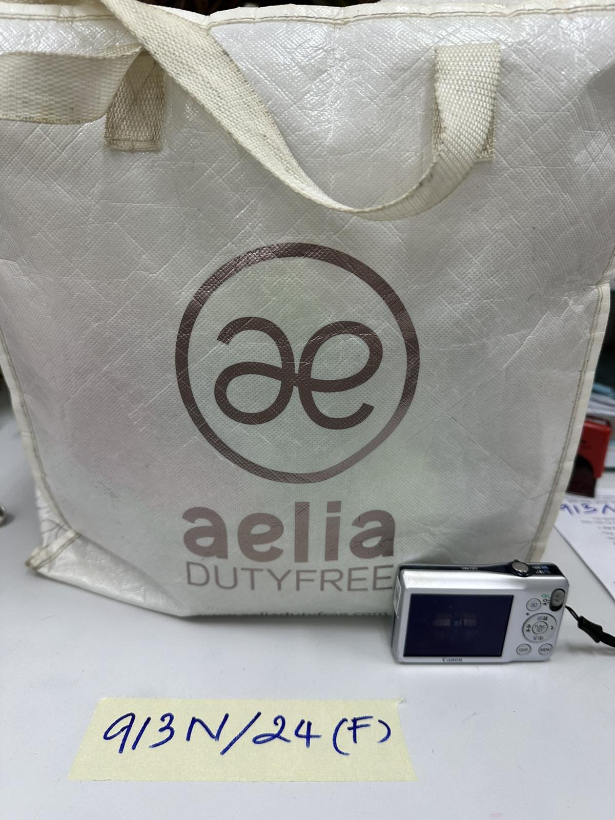 Ngày tiếp nhận: 11/6/2024 Mã hồ sơ: 913N2024F Mô tả: 01 túi màu trắng có chữ "aelia" bên trong có 03 đôi giày và 01 máy chụp ảnh. |