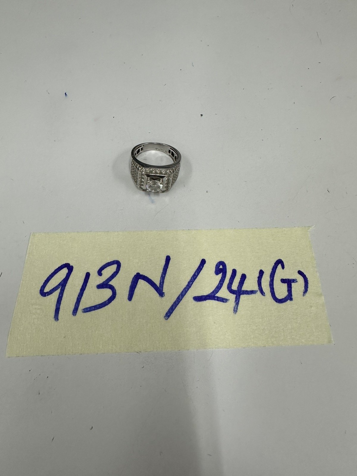 Ngày tiếp nhận: 11/6/2024 Mã hồ sơ: 913N2024G Mô tả: 01 nhẫn đeo tay kim loại màu trắng (có gắn đá màu trắng). |