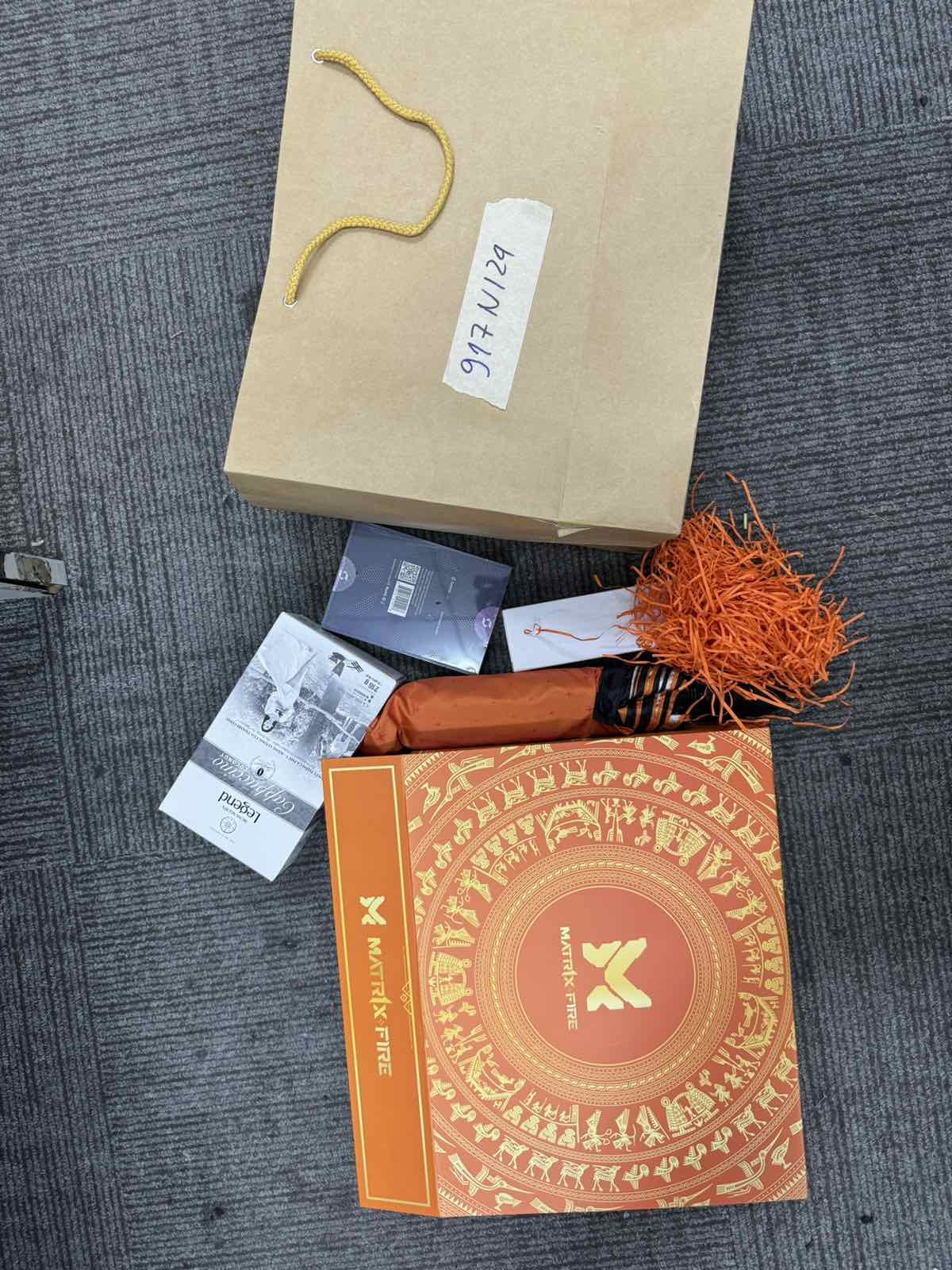 Ngày tiếp nhận: 12/6/2024 Mã hồ sơ: 917N2024 Mô tả: 01 hộp giấy màu cam bên trong có 01 hộp caphe, 01 cây dù, 01 cây viết, 01 máy tính. |