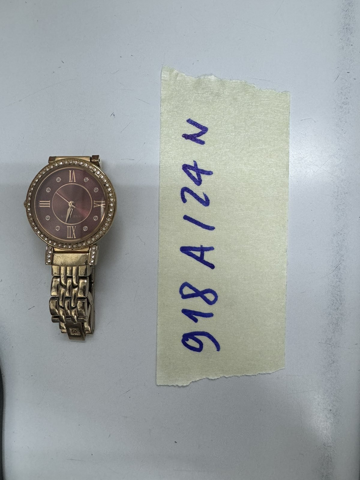 Ngày tiếp nhận: 12/6/2024 Mã hồ sơ: 918N2024A Mô tả: 01 đồng hồ kim loại màu vàng mặt tròn mặt đỏ có đính đá màu trắng có chữ "ANNE KLEIN". |