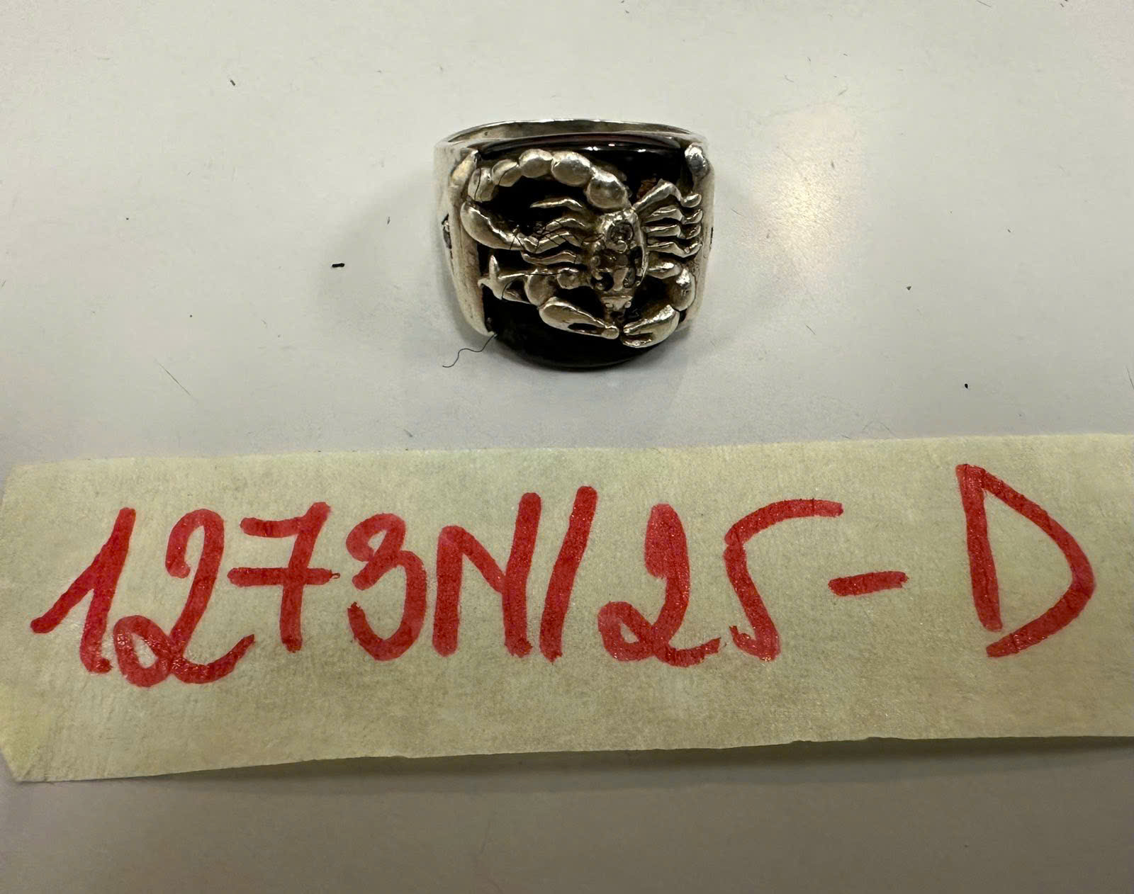 Ngày tiếp nhận: 12/7/2025 Mã hồ sơ: 1273N2025D Mô tả: 01 nhẫn màu bạc có họa tiết hình bọ cạp. |
