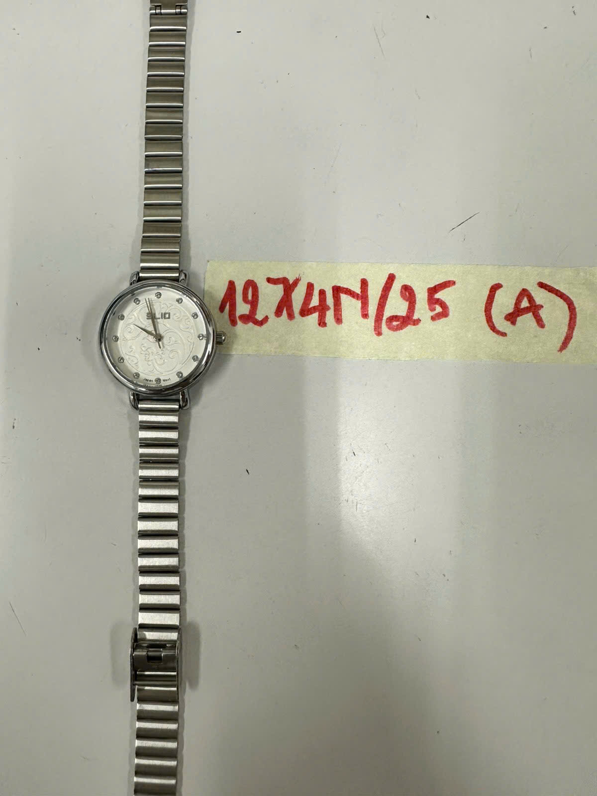 Ngày tiếp nhận: 12/7/2025 Mã hồ sơ: 1274N2025A Mô tả: 01 đồng hồ kim loại màu trắng mặt tròn có chữ ELIO, dây đeo kim loại màu bạc. |