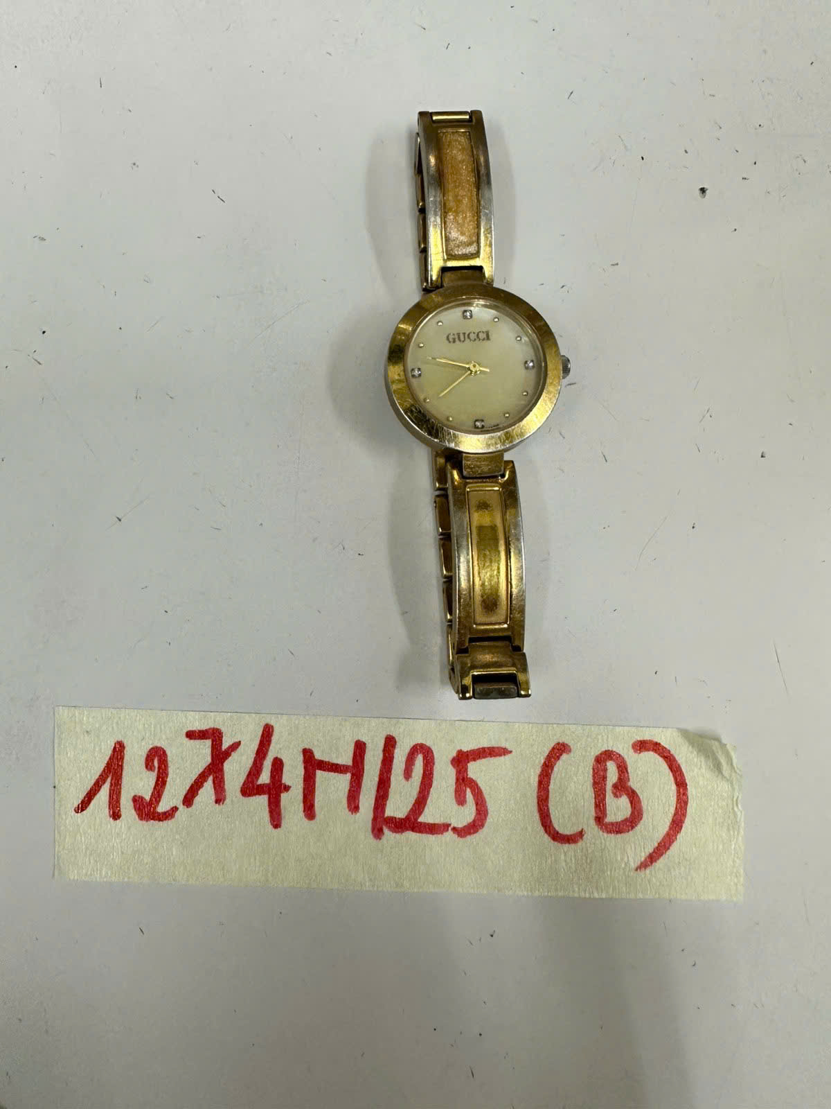 Ngày tiếp nhận: 12/7/2025 Mã hồ sơ: 1274N2025B Mô tả: 01 đồng hồ đeo tay bằng kim loại mặt tròn màu vàng có chữ GUCCI, dây đeo bằng kim loại màu vàng. |
