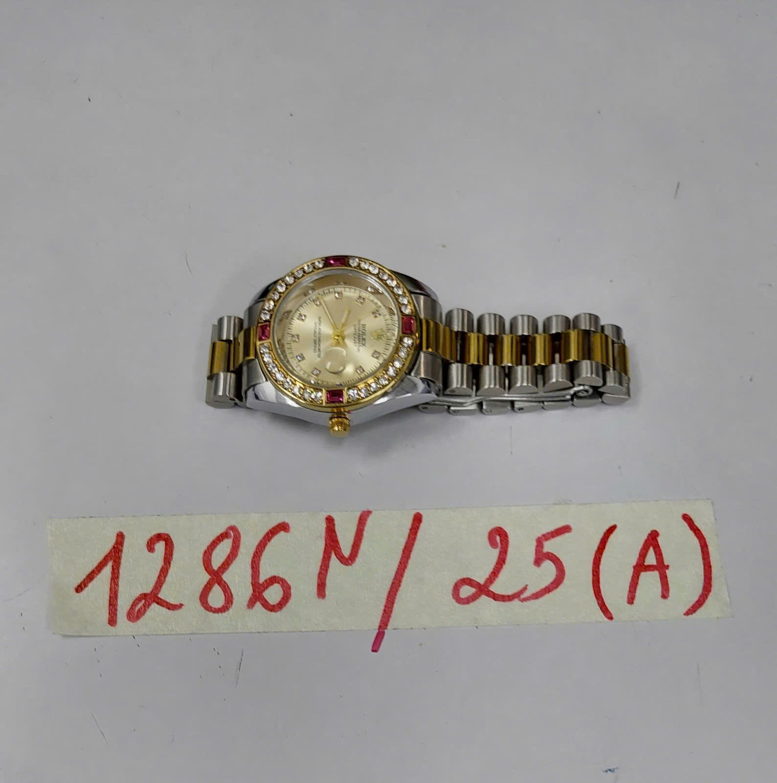 Ngày tiếp nhận: 14/7/2025 Mã hồ sơ: 1286N2025A Mô tả: 01 đồng hồ màu trắng vàng, mặt tròn có đính hạt màu trắng ghi chữ "ROLEX". |