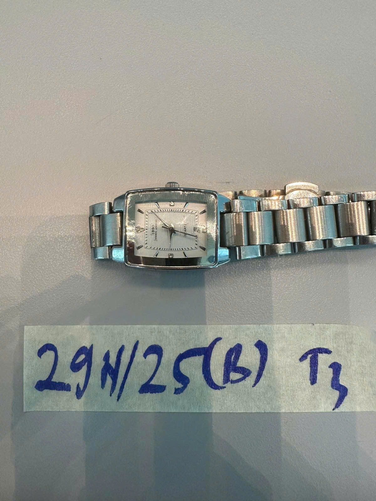 Ngày tiếp nhận: 12/9/2025 Mã hồ sơ: 29N2025B Mô tả: 01 đồng hồ kim loại màu bạc mặt vuông "IBSO". |