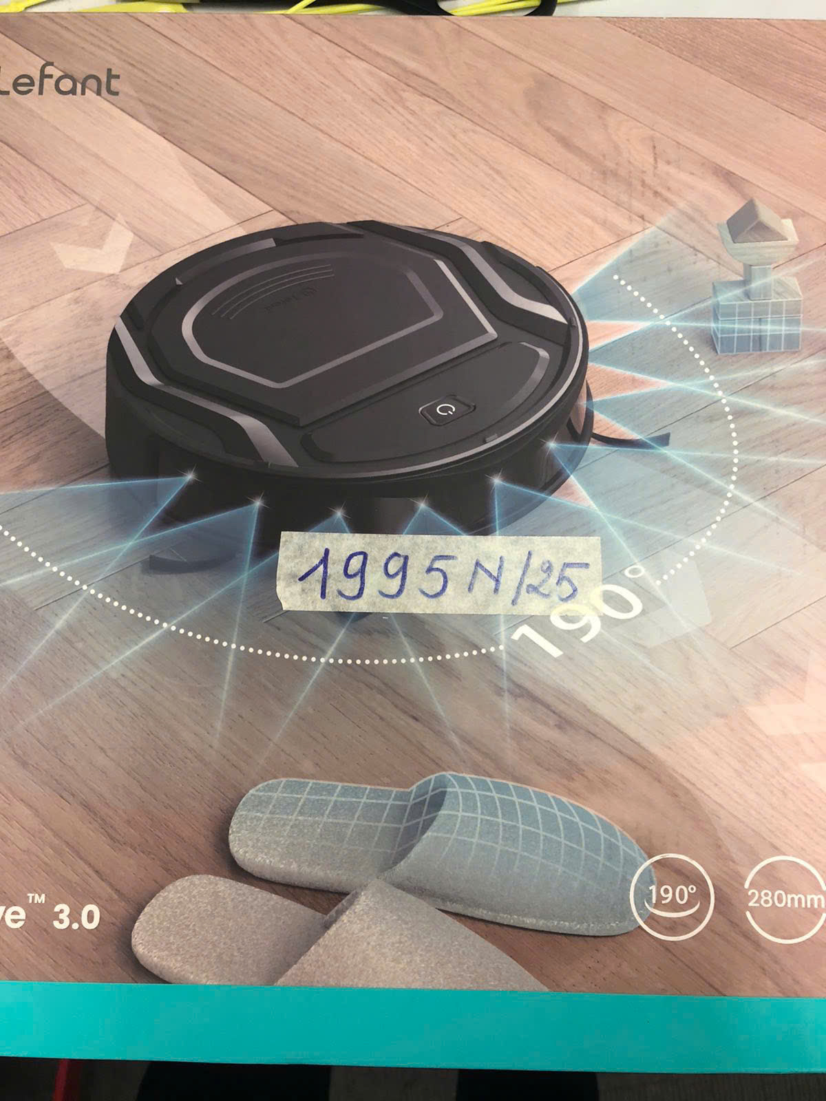 Ngày tiếp nhận: 12/11/2025 Mã hồ sơ: 1995N2025 Mô tả: 01 hộp giấy màu trắng và xanh có chứa : 1 robot hút bụi màu đen có chữ "Lefant". |